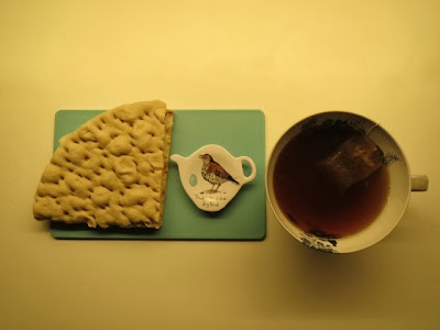 Vid sexsnåret, då kvällsfikar jag, och inviger dagens fynd att lägga tepåsar och tekulor på. (Ni får hålla till godo med trista lyrörs- och blixtbilder!)