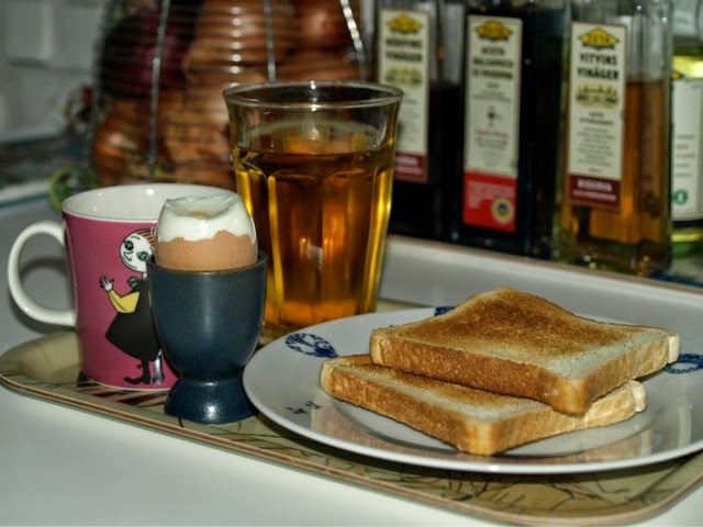 Vid niosnåret, då plockar jag på frukostbrickan.